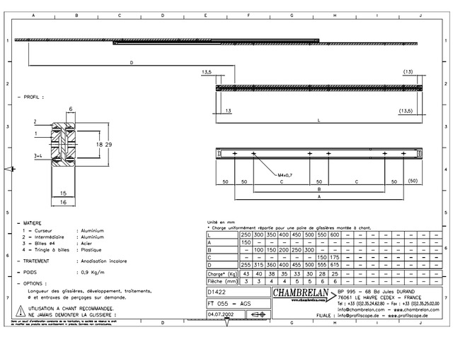 Slide total extention Aluminium D1422 - CHAMBRELAN GLISSIERES A BILLES et RAILS DE GUIDAGE INDUSTRIELS