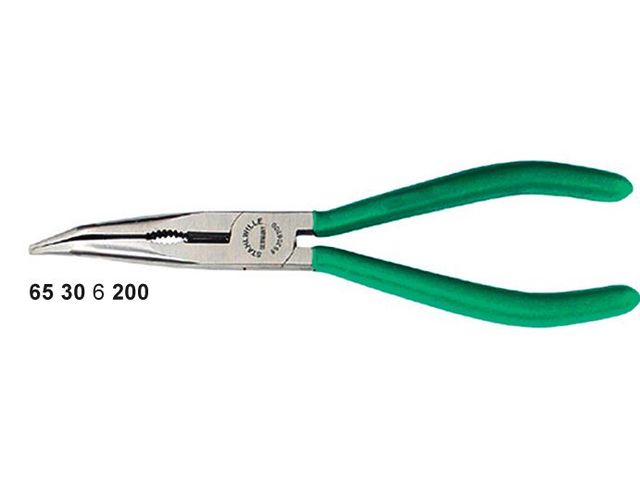 DIN ISO 5745, Form B, bent 45°, half round, long tapering, serrated jaws, with burner hole, precision cutting edges for soft and hard wires, induction hardened cutting edges, approx. 60 HRC.