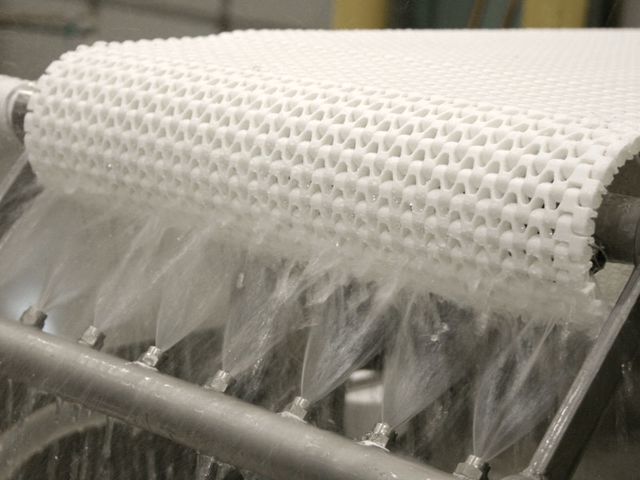 The CIP conveyors feature an automated washing system that not only reduces the time and labor required to keep your conveyors clean, but they help you save water and energy as well. Spray nozzles can be mounted on the interior and exterior of the conveyor, which allows cleaning both the top and bottom surfaces of the belt simultaneously without additional labor. For modular plastic chain belts, the CIP nozzles will force water and debris through the open hinges.