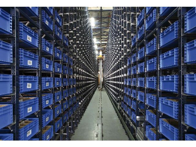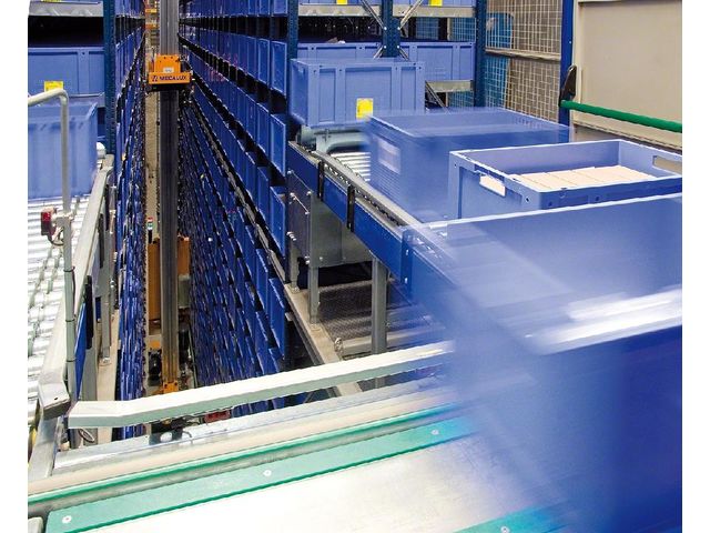 Automated warehouse boxes or trays storage system that integrate shelving, machinery and warehouse management software all in one. It is made up of a central aisle, along which a stacker crane travels, and two racks built at either side used to store boxes or trays. The picking and handling area is formed by conveyors and is positioned at one end or at the side of the racking. Here, the stacker crane deposits the load extracted from the rack.