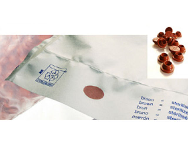 By changing colour, a printed-on sterility indicator confirms that water vapour sterilisation has taken place.