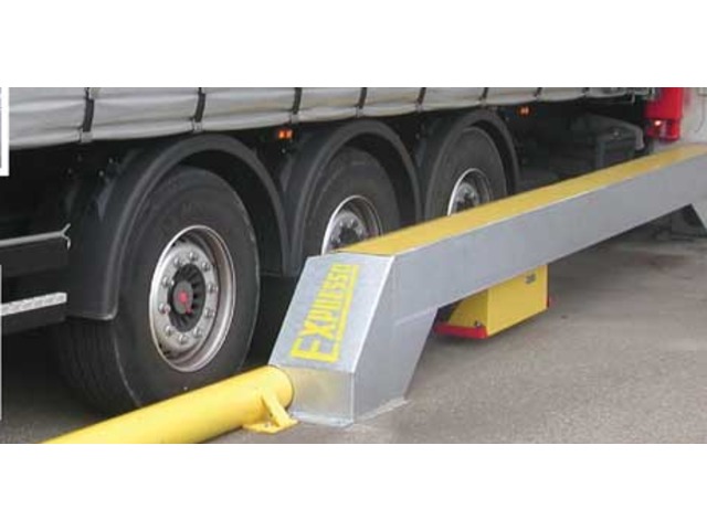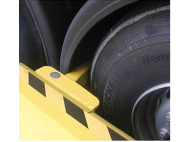 The flat blocking arm, acts at the level of the axis of the wheel of the truck, about is its diameter, to assure a maximal blocking while protecting mudguards (blocking without damages), preventing any movement of the vehicle, voluntary or not.