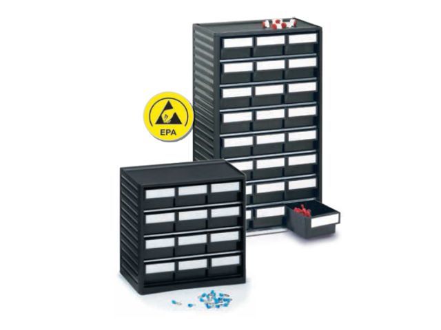 Cabinets come with a connector for a ground-connection cord as standard. Accessories: cross dividers made of semiconductive polypropylene (PP).