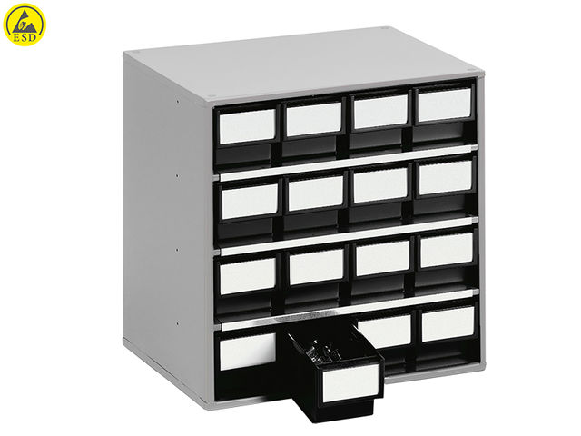 This product includes a frame, bins and labels with protective shields. The steel frame has a semiconductive ESD powder-coat finish in grey, the bins are of semiconductive polypropylene (PP). Backstops hold the bins when fully extended.