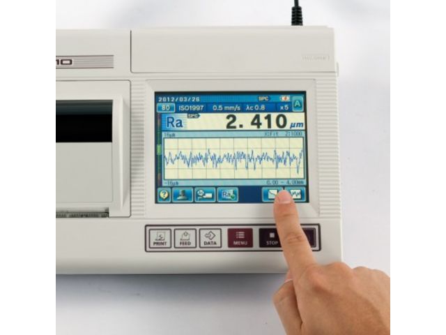 A Mitutoyo portable surface roughness tester able to operate independently of mains power and make measurements on almost any part of a workpiece of practically any size. The large 5.7” color LCD with touch-screen functionality improves operability and provides high visibility. Statistical analysis of up to 3 parameters from 300 samples can be performed showing average, standard deviation, max, min, pass rate and histogram. Up to ten measurement setups, along with stored data, can be displayed and printed out on the built-in thermal printer, or stored in the built-in memory.