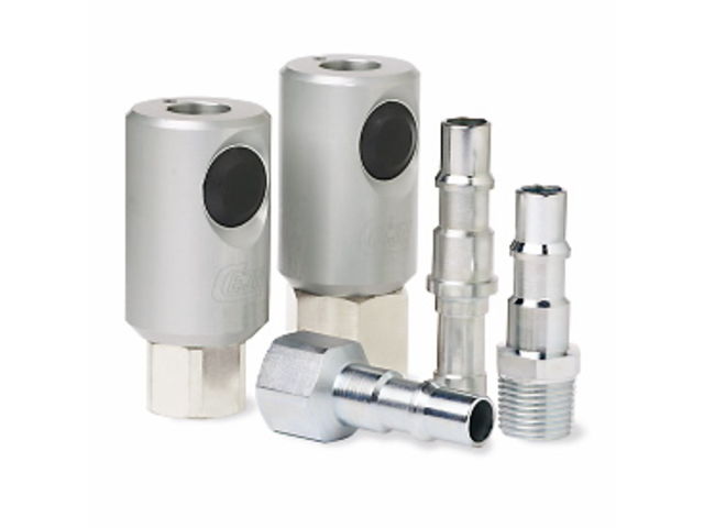 Safety : ISO 4414 safety coupling Temperature : +5°F to 158° F Construction : Composite body Use : Pneumatic tools ID Passage : 1/4 body size Pressure : 174 psi Air flow at 100 PSI : 34 Scfm - DP = 10 psi Weight : 2.6 OZ (hose stem coupler) Color : Black body / Blue button