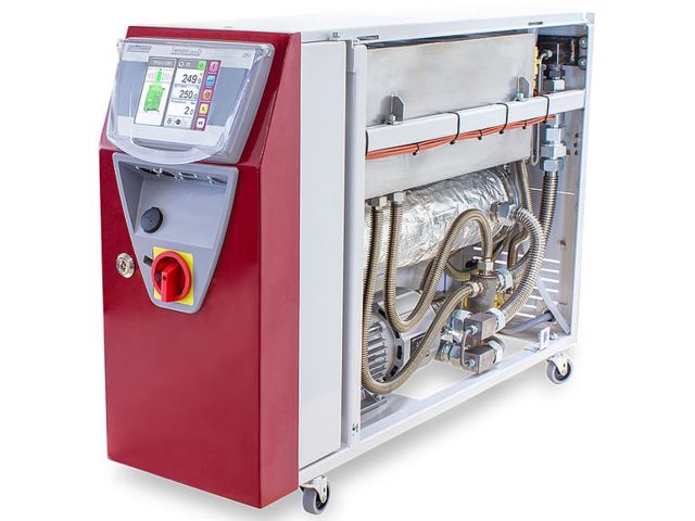 The Wittman Battenfeld TEMPRO Plus-250, a user-friendly temperature controller, specially features the following properties/specifications: a built-in pinpoint-precision microprocessor control with ± 1 °C accuracy, a double-level control which forces automatic switch-off/warnings, a line evacuation for mold purge procedures and finally, a non-seal magnetically-coupled pump.