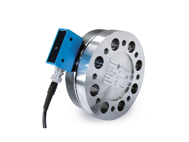 Based on strain-gauge technology, the TF Sensor’s precise telemetry system enables highly accurate signal transmission. A signal amplifier mounted in the measuring flange amplifies the measuring signal, modulates it to high frequency and transmits it inductively (via the HF transmitter) to the conditioner. In the conditioner, the digitized torque signal is transformed into an analog output signal of ±5 V DC. Rotational speed can be measured and converted to a TTL output signal with the optional speed sensor.