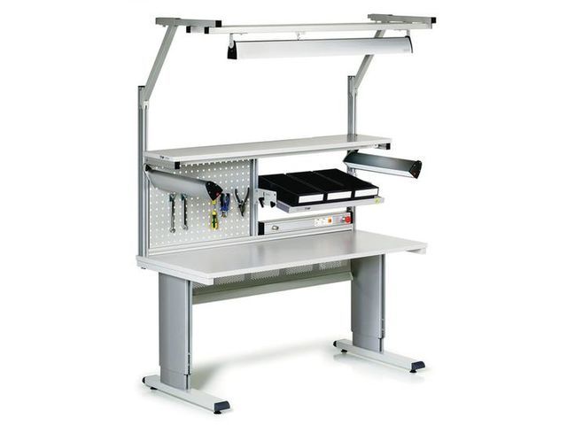Treston WB workbenches are particularly suitable for use in the electronics industry. The worktop can be steplessly adjusted, with either an electric motor, a hand crank, or an Allen key. Above workbench modules and a wide range of accessories and add-ons enable putting together a highly ergonomic workstation. The workbenches in this product family can be positioned seamlessly side-by-side, back-to-back, or against a wall in various different layouts.