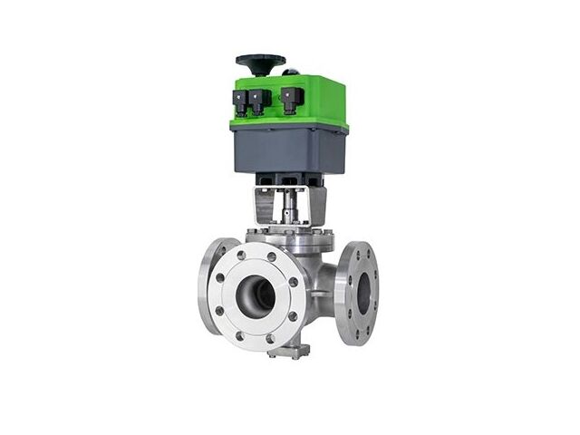 The three-way ball sector valve type 4083 with electric actuator in diverting or mixing function is ideal for a wide range of process control applications. Due to its design, the three-way ball sector valve enables high-precision control (rangeability of 100:1) over a wide range and features exceptionally high Kvs values in all flow directions.
