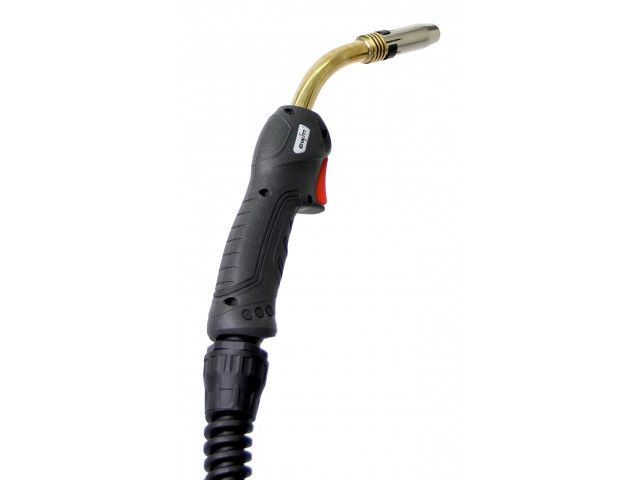Gas-cooled MIG/MAG welding torch with ergonomic grip and ball joint, anti-kink spring on welding torch as well as on connection. Can be connected to all machines with standard Euro torch connector. Type-related standard consumables M6/M8. Available in 4 variants: UM 15 G – DC CO2 180 A at 60% | DC M21 150 A at 60% UM 24 G – DC CO2 250 A at 60% | DC M21 220 A at 60% UM 25 G – DC CO2 230 A at 60% | DC M21 200 A at 60% UM 36 G – DC CO2 300 A at 60% | DC M21 270 A at 60% Available each with 3 metre, 4 metre and 5 metre hose package.