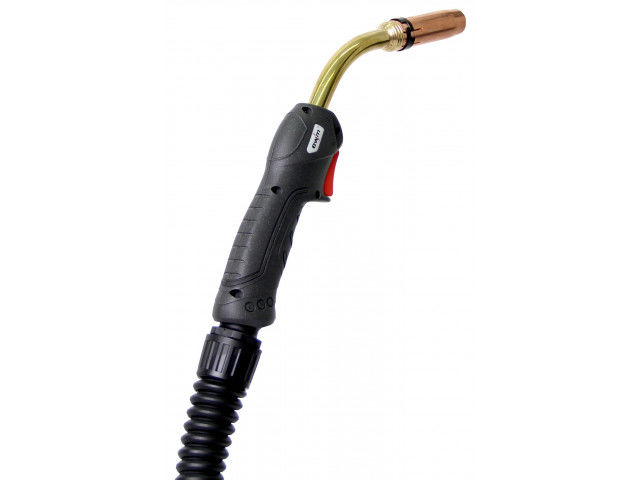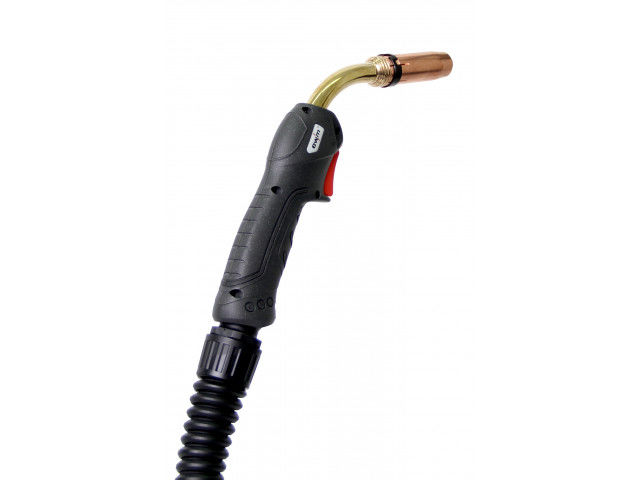 Water-cooled MIG/MAG welding torch with ergonomic grip and ball joint, anti-kink spring on welding torch as well as on connection. Can be connected to all machines with standard Euro torch connector. Type-related standard consumables M6/M8 UM 240 W - DC CO2 300A at 100% | DC M21 270A at 100% UM 401 W - DC CO2 400A at 100% | DC M21 350A at 100% UM 501 W - DC CO2 500A at 100% | DC M21 450A at 100% Available each with 3 metre, 4 metre and 5 metre hose package.