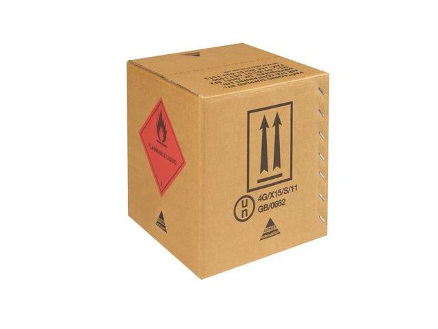 UN 4G box for 1 x 5L UN steel drum with flammable Liquid Hazard Label, 4G/X15/S - CODE 114 - Box for dangerous, infectious products