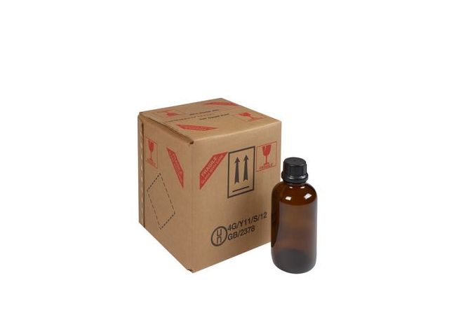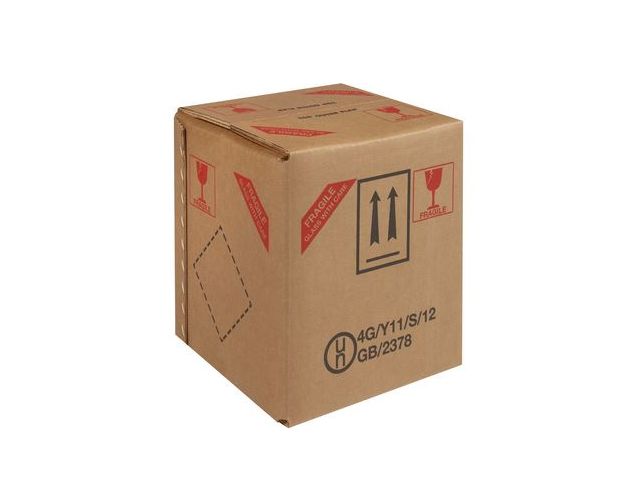 UN 4G box, approved to ship 4 x 1L glass bottles.