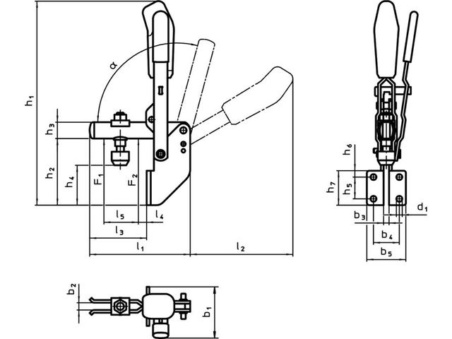The "toggle" principle of the toggle clamp allows a large and quick opening of the clamp. If unclamped the work pieces are completely cleared for unimpeded removal. The large power transmission results maximum clamping force by low hand force. The clamps are self-arresting they remain locked, resisting the force produced when machining components.