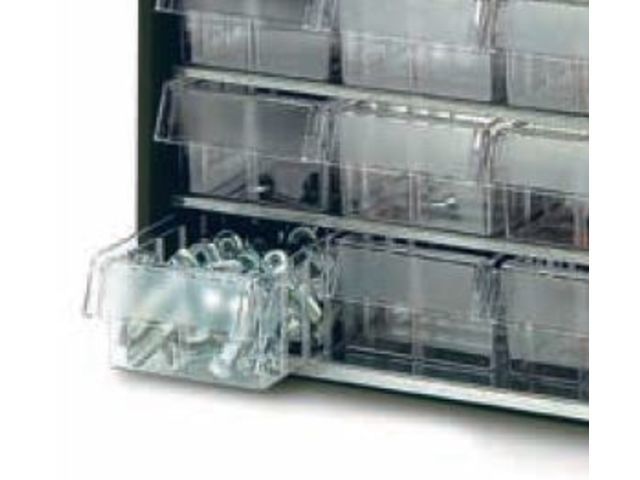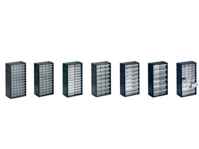 The series features seven different cabinets with a height of 550 mm. This series comes with a grey frame (RAL7016), crystal clear drawers and self-adhesive labels.