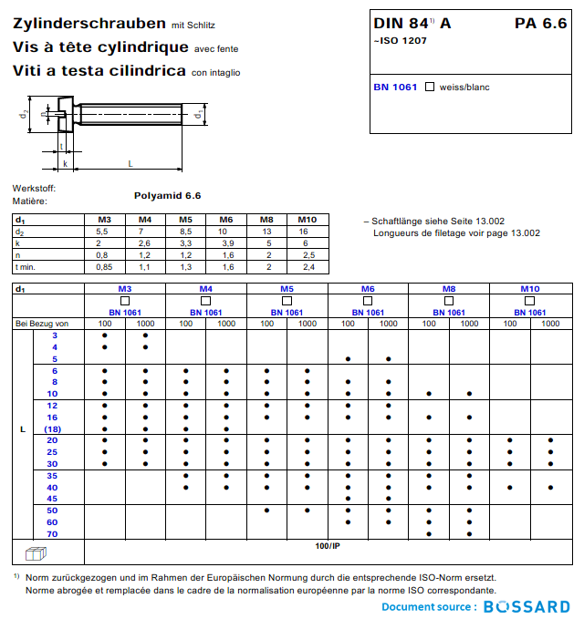 Visserie Nylon : Tête Cylindrique Fendue TC Din 84 Nylon PA6-6 Naturel