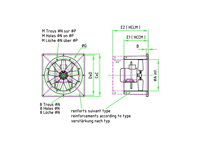 Wall axial fans with fixation plate. Short HCCM or long HCLM casing, direct driven. Version HC-EX for ATEX.