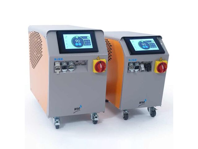 The water mold controller90°C, E.THERM type W90-S6/9-T7, in 6 or 9 kW is the most compact of the S.I.S.E. new range with color touchscreen 7''. It is equipped in standard with a 60 L/min – 3.5 bar submersible pump, able to operate in negative pressure mode (mould purge feature). Temperature control is assured by a self-tuning microprocessor controller. The system is equipped with temperature and level monitoring functions, and a safety thermostat. Additionally, it comes with a static relay and solenoid valves direct acting.