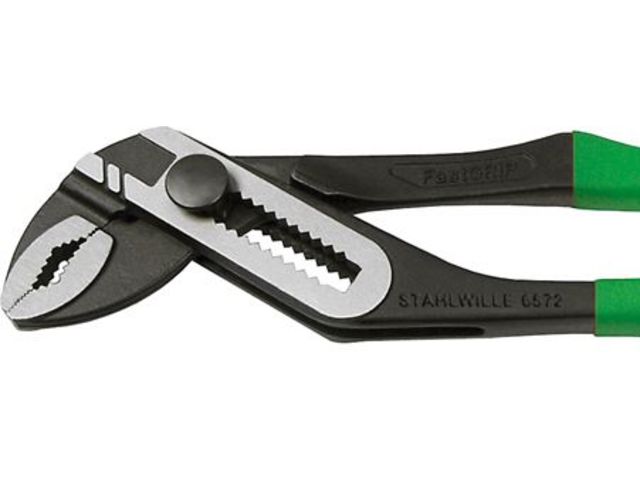 Patent, box joint with dual support, fast adjustment on the work piece via push button, freely adjustable, easy super fine adjustment with 10 snap-in points (180 mm), 12 snap-in points (240 mm), 15 snap-in points (300 mm), induction hardened jaw toothing - extremely hard and durable, safety clamping protection against squeezing injuries, Chrome Vanadium.