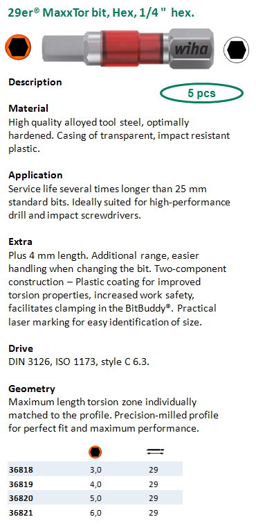 Wiha : WIHA- Embouts - Embouts Maxxtor - Embouts MaxxTor de 29 Six Pans, forme C 6,3