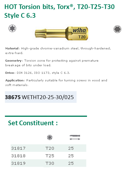 Wiha : WIHA- Embouts - Embouts Torsion Hot ou Zot - Jeu d'Embouts Torsion HOT TORX 25 mm