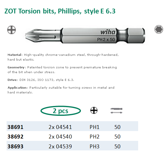 Wiha : WIHA- Embouts - Embouts Torsion Hot ou Zot - Embouts Torsion ZOT Phillips 50 mm forme E 6,3