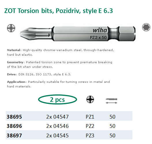 Wiha : WIHA- Embouts - Embouts Torsion Hot ou Zot - Embouts Torsion ZOT Pozidriv 50 mm forme E 6,3