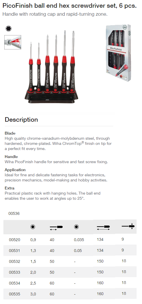 Wiha : WIHA Tournevis - Tournevis PicoFinish - Jeu de Tournevis Six Pans à Tête Sphérique PicoFinish, 6 pièces