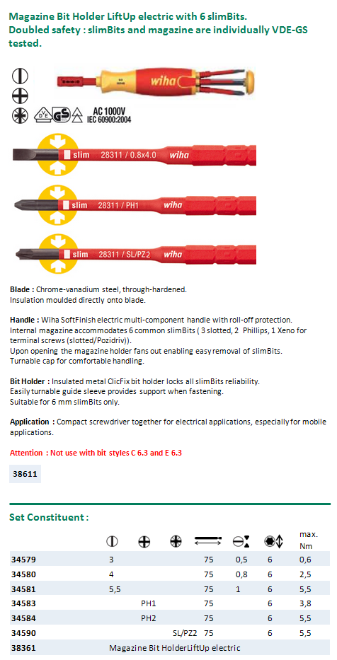Wiha : WIHA Tournevis - Tournevis SoftFinish Electric SlimVario - Porte-Embout à Magasin LiftUp Electric avec 6 slimBits