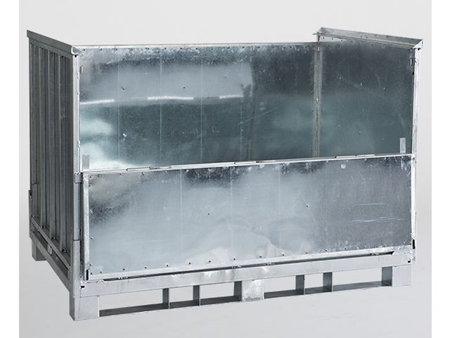 Crate with entirely collapsible sides that can be turned around for all heavy loads.